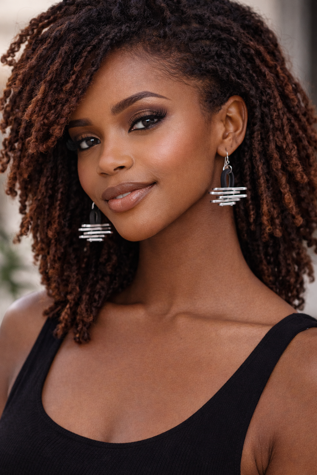 This contemporary drop earring features stacked silver rings suspended beneath a sleek black accent, creating...