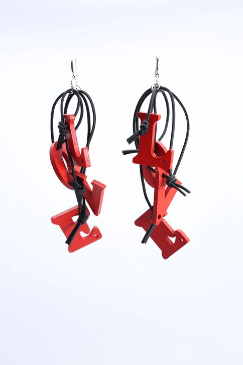 Shae he LOVE with these beautiful handmade light weight wooden earrings. The four letters dangle...