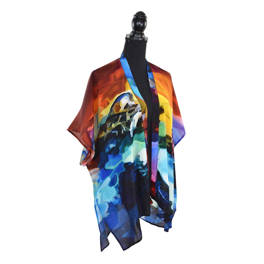 This piece feels like wearable color. The fluid shape moves easily over a dress or slim pant and instantly makes the outfit look finished. The blues and warm sunset tones frame the face beautifully, which is why women reach for it when they are going somewhere that matters.