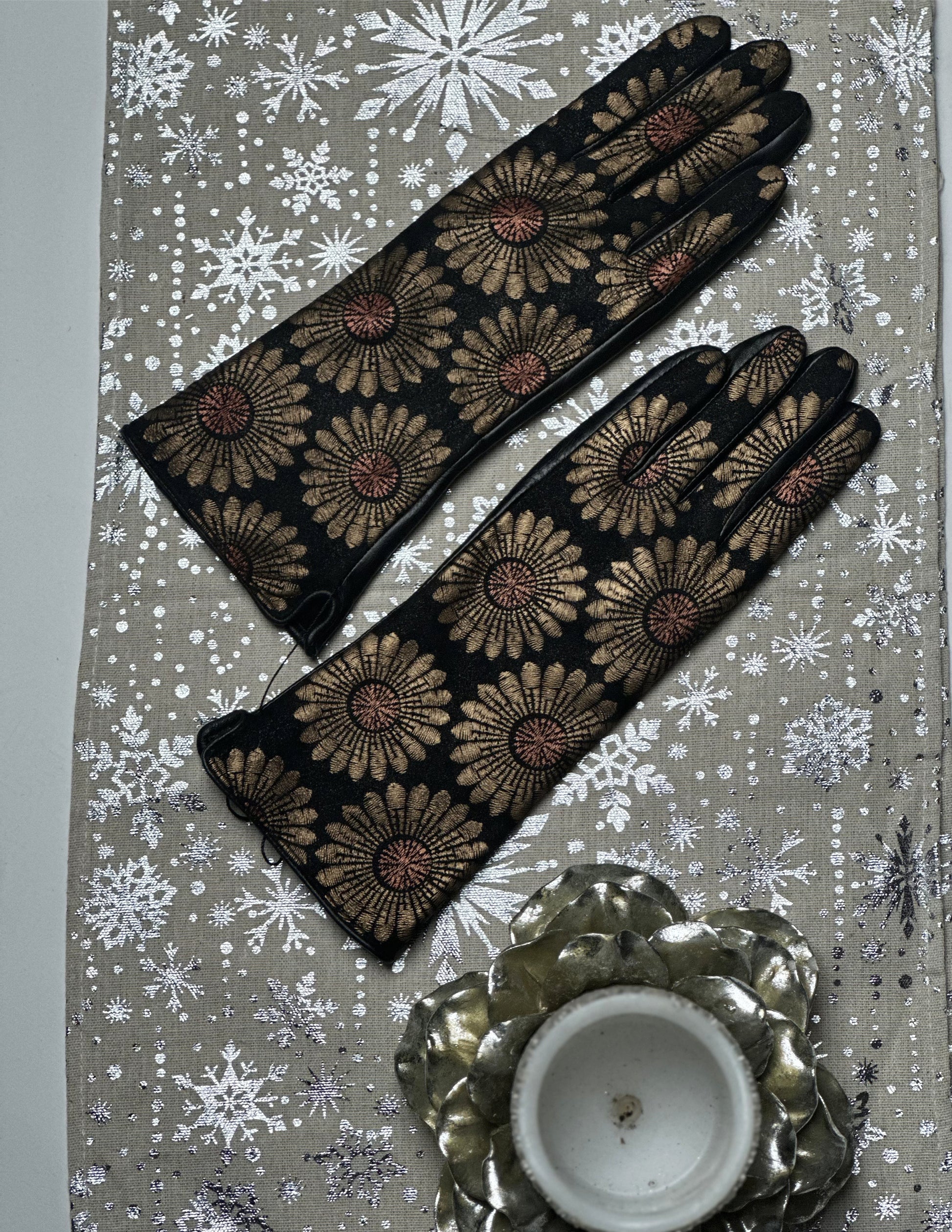 These gloves bring a bold, elegant touch to your winter look. The black base is covered in oversized gold-toned daisy motifs that feel rich without being flashy. They’re smooth, flexible, and comfortable — easy to pair with your dress coats and capes. A stylish way to pull your outfit together while keeping your hands warm.