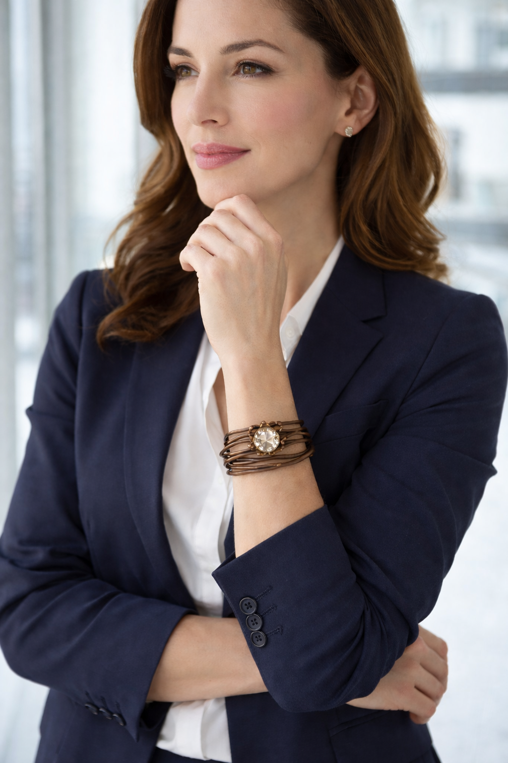 Accessorize with distinction with our Solar Statement Bracelet, a captivating piece designed to add a touch of modern elegance to any look. This exquisite bracelet features multiple sleek bands in a coordinating metallic tone, brought together by a central leather accent and a sparkling halo-set crystal. Perfect for adding a refined shimmer, it effortlessly complements both everyday wear and sophisticated evening attire.