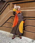 Make a bold entrance in this artfully designed Sunburst Wool Maxi Coat, a statement piece that radiates joy and confidence. Crafted in a rich espresso brown wool blend, this full-length coat features sweeping panels of sunset orange and golden yellow, creating a warm, modern burst of color.