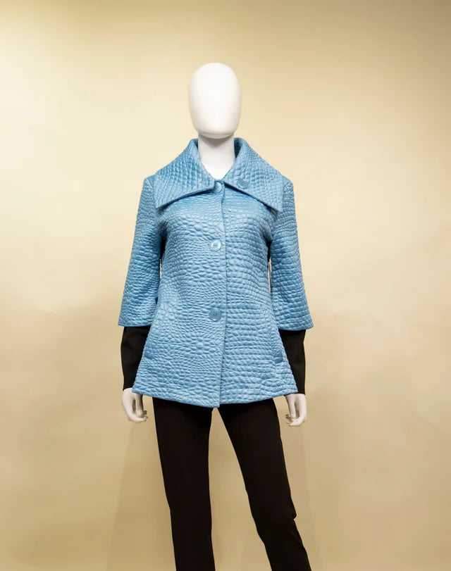 Make a sleek statement in our Short Croco Jacket, a luxurious ice blue knit jacquard featuring a subtle cheetah-inspired texture that evokes the look of crocodile skin. This modern, cropped silhouette adds polish to any outfit while keeping your look effortlessly cool. Soft yet structured, it’s the perfect layer to elevate everything from your favorite jeans to an elegant dress. A true wardrobe standout — sophisticated, stylish, and distinctly The Brownstone.