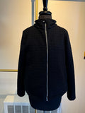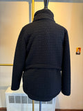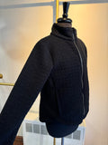 A modern twist on cozy sophistication, this black zip-front jacket features a subtle puzzle piece jacquard design that adds texture and depth. The structured silhouette and soft quilted feel make it perfect for layering through the seasons. Effortlessly chic and endlessly versatile, this piece pairs beautifully with everything from sleek pants to your favorite weekend dress.